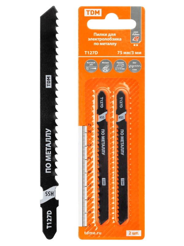 Пилки для электролобзика по металлу, HSS, 75х3 мм, быстрый рез, T127D, 2 шт, "Рубин", TDM