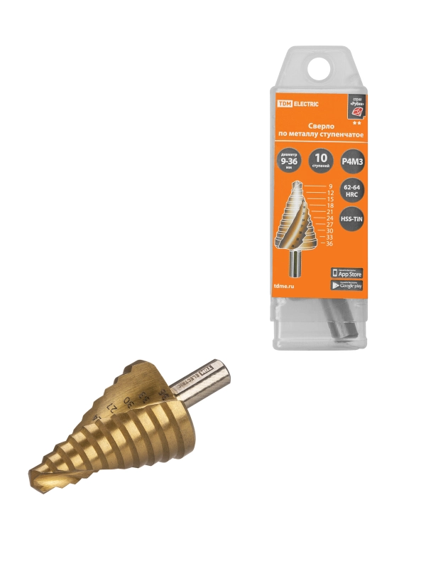 TDM Сверло по металлу ступенчатое, 9-36 мм, 10 ступеней, нитрид., HSS, цилиндр. хв., "Рубин"