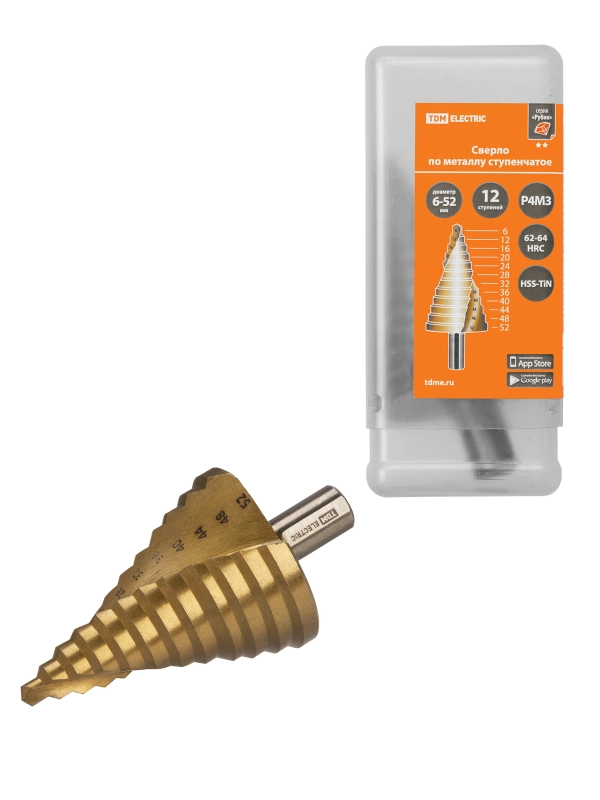 TDM Сверло по металлу ступенчатое, 6-52 мм, 12 ступеней, нитрид., HSS, цилиндр. хв., "Рубин"
