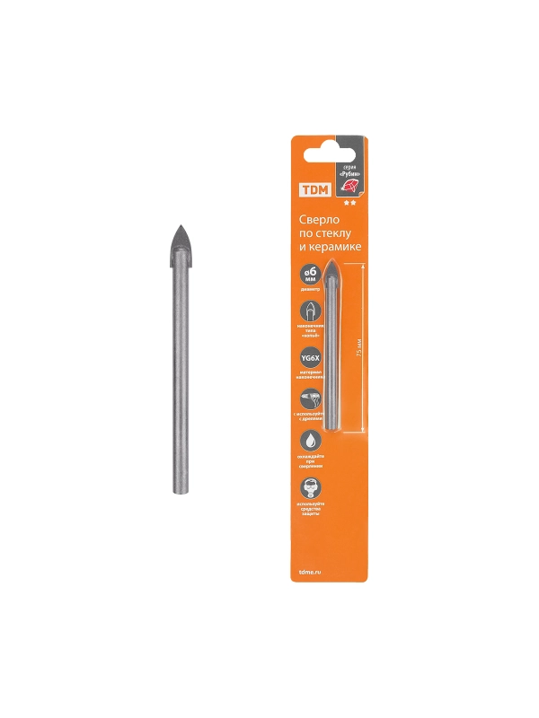 Сверло по стеклу и керамике 6?75 мм, 2 реж., лезвия, цилиндр. хв., блистер 1 шт, "Рубин" TDM