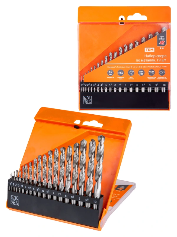 Набор сверл по металлу, 19 шт. (1-10) мм, шаг 0,5 мм, полир., HSS, ц. хв., пластик. уп., "Рубин" TDM