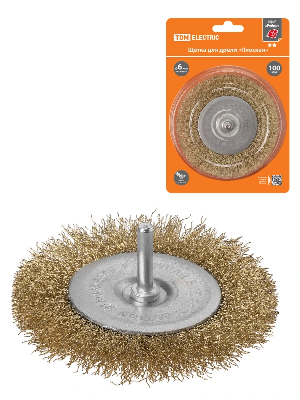 Щетка для дрели "плоская", 100 мм, латунированная витая проволока d 0,3 мм, "Рубин", TDM