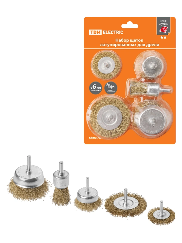 Набор щеток для дрели, латунированных, 5 предметов: "плоские" 50,75 мм, "чашки" 25,50,75 мм, "Рубин", TDM