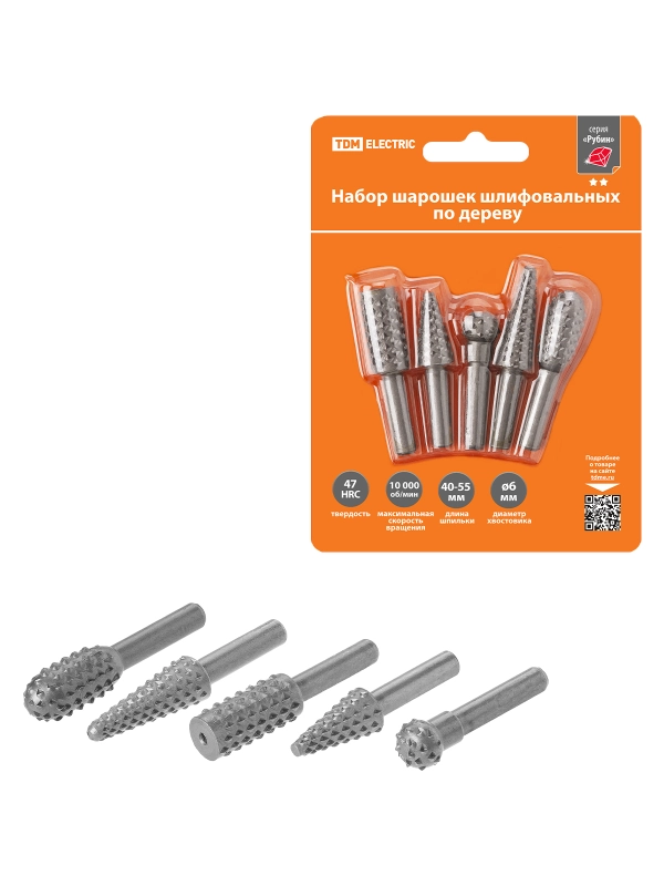 Набор шарошек шлифовальных, рашпильных, ? 6 мм, L 40-55 мм, по дереву, 5 шт, "Рубин" TDM