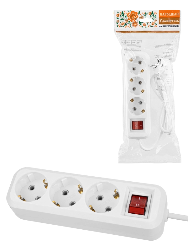 Удлинитель народный УН03В выключатель, 3 гнезда, 10метров, с/з, ПВС 3х0,75мм2 10А/250В
