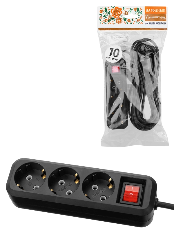 Удлинитель 3 гнезда, 10 метров, с/з, выкл., 10 А, 2300 Вт, черный, НАРОДНЫЙ У1-32055 (Ун1 321-0001)