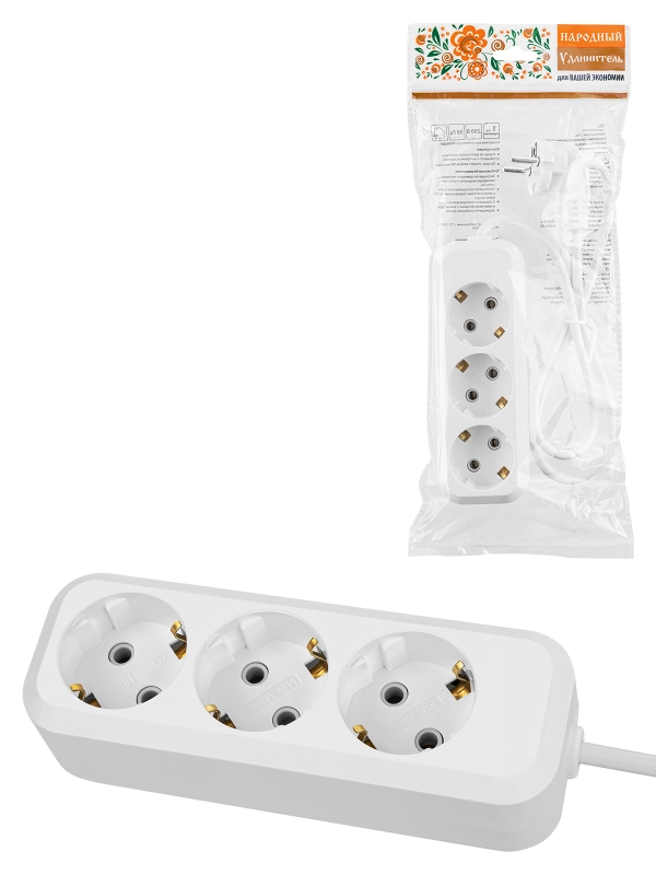 Удлинитель 3 гнезда, 5 метров, с/з, 16 А, 3500 Вт, белый, НАРОДНЫЙ