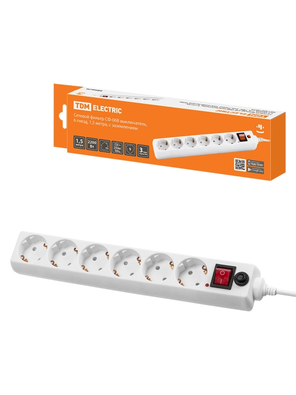 Сетевой фильтр СФ-06В выключатель, 6 гнезд, 1,5 метра, с/з, ПВС 3х0,75мм2 10А/250В белый TDM
