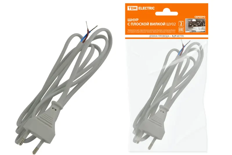 Шнур с плоской вилкой ШУ02 ШВВП 2х0,75мм2 1,7 м. серебр. металлик TDM