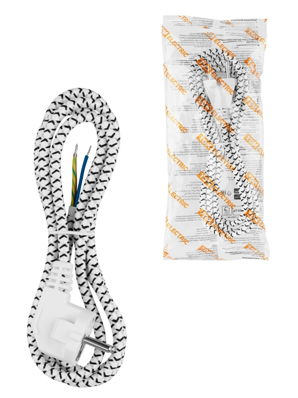 Шнур сетевой с вилкой в тканевой оплетке ПВС-ВП 3x0,75мм2 1,8м, 2400 Вт с/з белый TDM