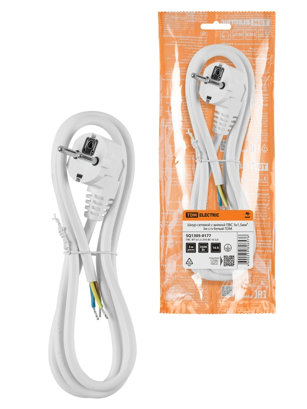 Шнур сетевой с вилкой ПВС-ВП 3x1,5мм? 3м с/з белый TDM