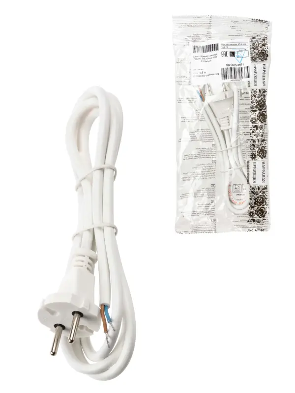 Шнур сетевой с вилкой ПВСмб 2x0,75мм2 1,5м б/з белый Народный