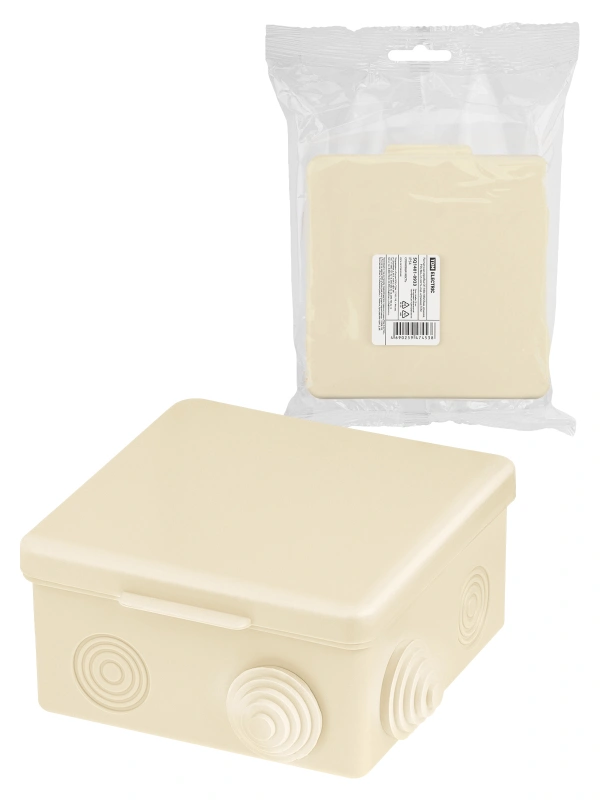 Распаячная коробка ОП 100х100х55мм, крышка, IP54, 8вх., сл. кость, инд. штрихкод TDM