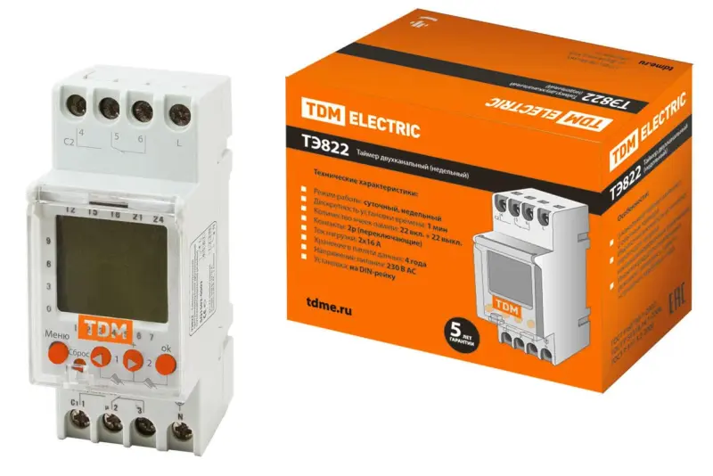 Таймер электронный двухканальный на DIN-рейку ТЭ822-2кан-1мин/7дн-44on/off-16А-DIN TDM