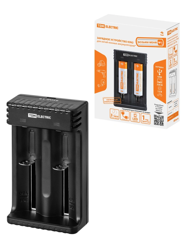 Зарядное устройство для литиевых аккумуляторов ION2 (0.5/1A, 2 слота, 10440/18650/26650), USB, TDM