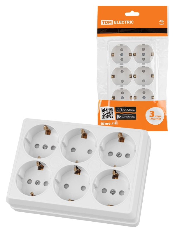 Розетка шестиместная 2П+3 открытой установки IP20 16A с защитными шторками белая "Ладога" TDM