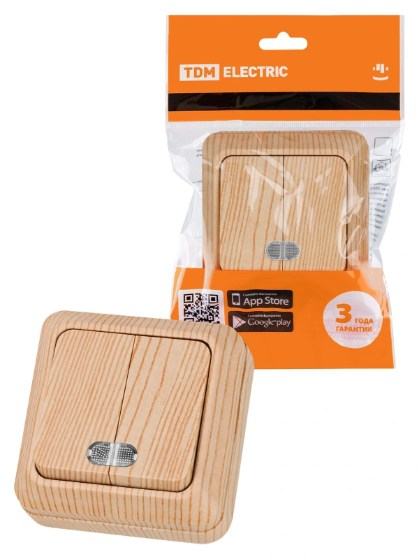 Выключатель 2-кл. открытой установки с подсветкой IP20 10А, сосна "Ладога" TDM