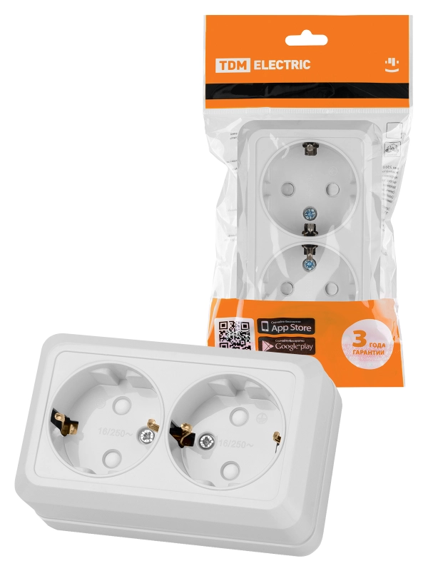 Розетка двойная 2П+З открытой установки с з/ш IP20 16А, белый "Ладога" TDM
