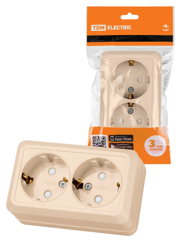 Розетка двойная 2П+З открытой установки с з/ш IP20 16А, слоновая кость "Ладога" TDM