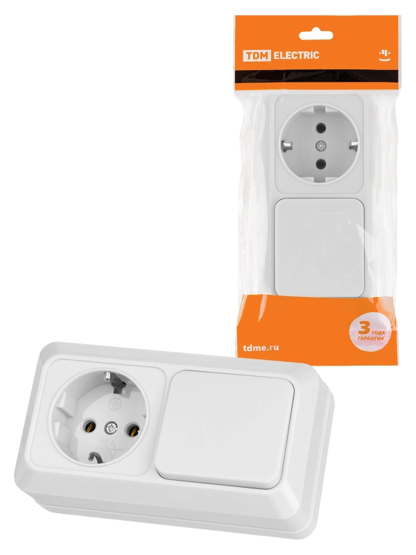 Блок комбинированный выкл. 1-кл. 10А + розетка 2П+З 16А 250В БКВР IP20 белый "Ладога" TDM
