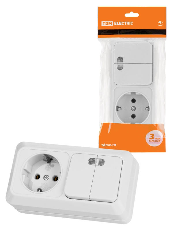 Блок комбинированный выключатель 2-кл. 10А с подсветкой + розетка 2П+З 16А 250В БКВР IP20 белый "Ладога" TDM