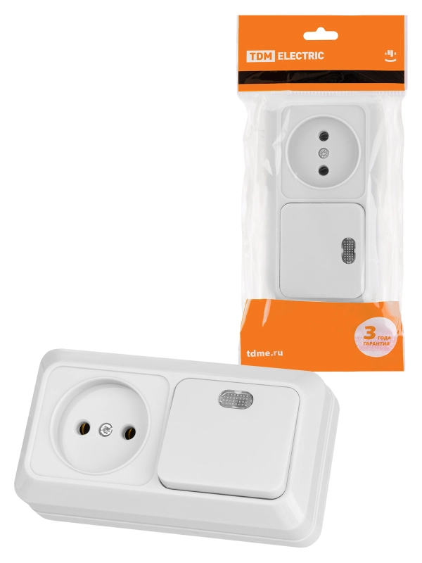 Блок комбинированный выключатель 1-кл. с подсветкой 10А + розетка 2П 10А 250В БКВР IP20 белый "Ладога" TDM