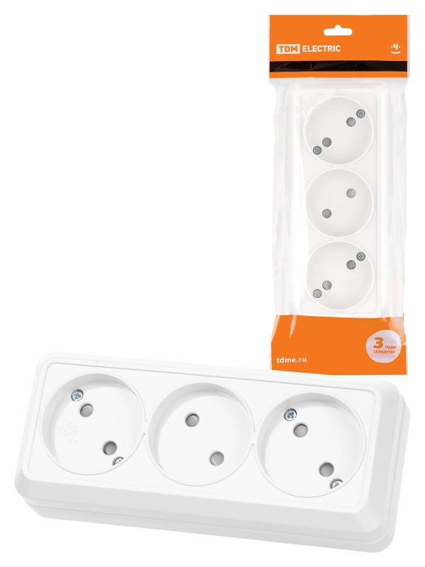 Розетка 3-х местная горизонтальная 2П открытой установки IP20 10A с з/ш белая "Ладога" TDM