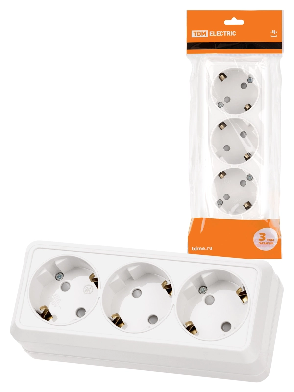 Розетка 3-х местная горизонтальная 2П+3 открытой установки IP20 16A с з/ш белая "Ладога" TDM