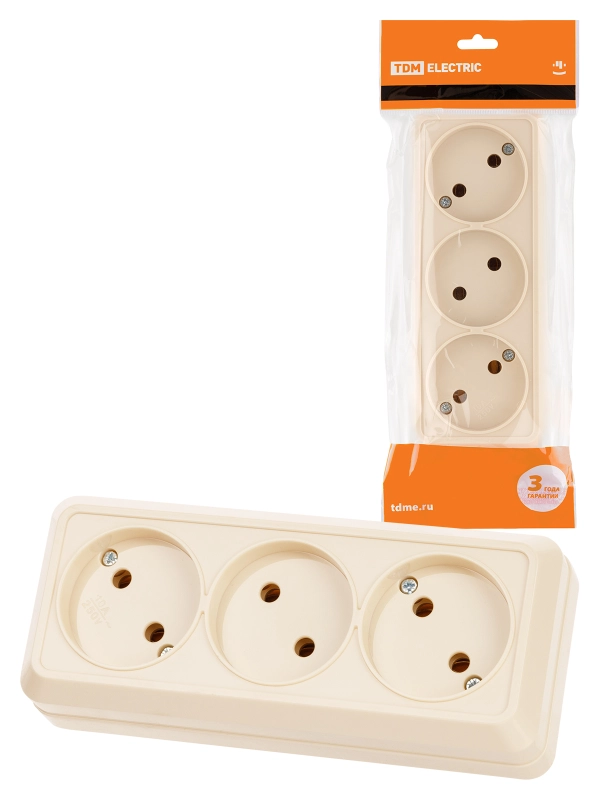 Розетка 3-х местная горизонтальная 2П открытой установки IP20 10A сл. кость "Ладога" TDM