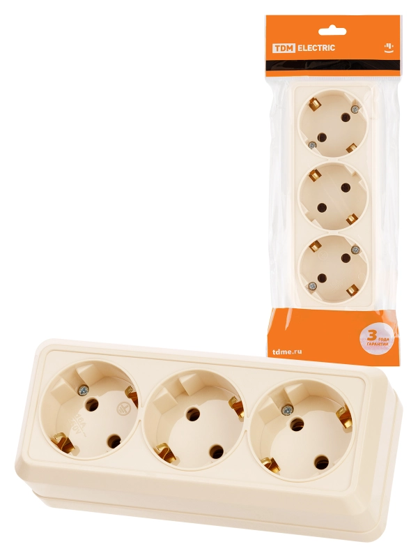 Розетка 3-х местная горизонтальная 2П+3 открытой установки IP20 16A сл. кость "Ладога" TDM