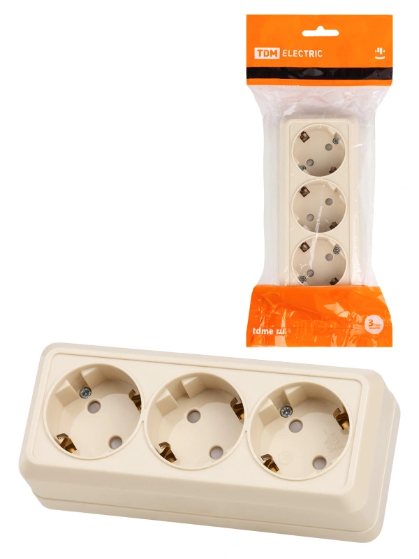 Розетка 3-х местная горизонтальная 2П+3 открытой установки IP20 16A с з/ш сл. кость "Ладога" TDM