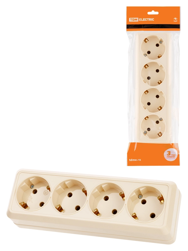 Розетка 4-х местная горизонтальная 2П+3 открытой установки IP20 16A сл. кость "Ладога" TDM