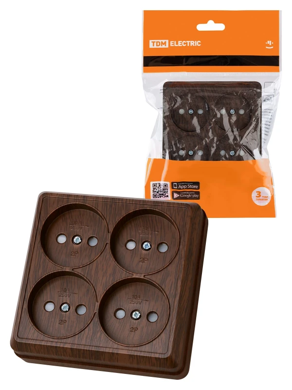 Розетка четырехместная 2П открытой установки IP20 10A с защитными шторками бук "Ладога" TDM