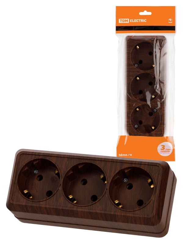 Розетка 3-х местная горизонтальная 2П+3 открытой установки IP20 16A бук "Ладога" TDM