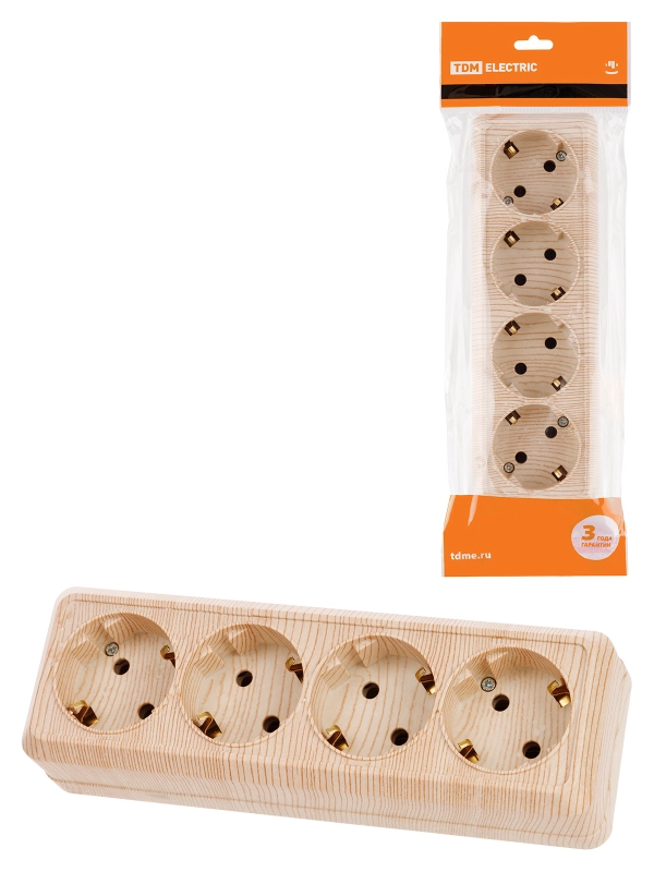 Розетка 4-х местная горизонтальная 2П+3 открытой установки IP20 16A сосна "Ладога" TDM
