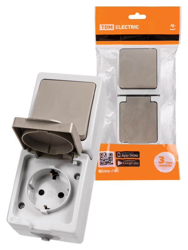Блок (вертикальный) выключатель 1-кл. + розетка 2П+З с з/ш БКВР IP54 серый "Вуокса" TDM