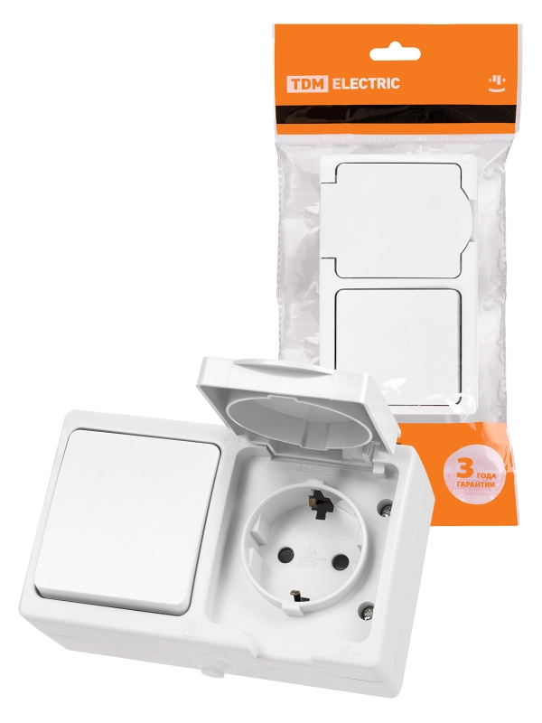 Блок (горизонтальный) выключатель 1-кл. + розетка 2П+З с з/ш БКВР IP54 белый "Вуокса" TDM