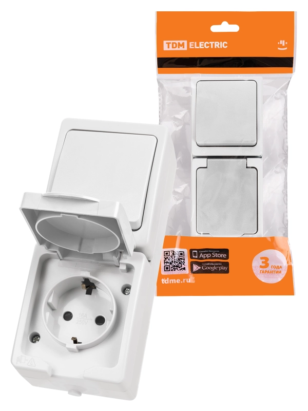 Блок (вертикальный) выключатель 1-кл. + розетка 2П+З с з/ш БКВР IP54 белый "Вуокса" TDM