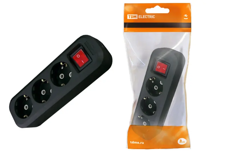 Колодка розеточная 3 гнезда 2П+3 c выключателем 16А 250В черная TDM