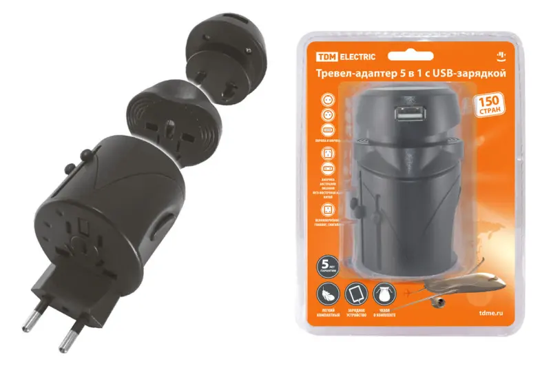 Тревел-адаптер 100-250В 2,5A (5 в 1) c USB-зарядкой 1000мА черный TDM