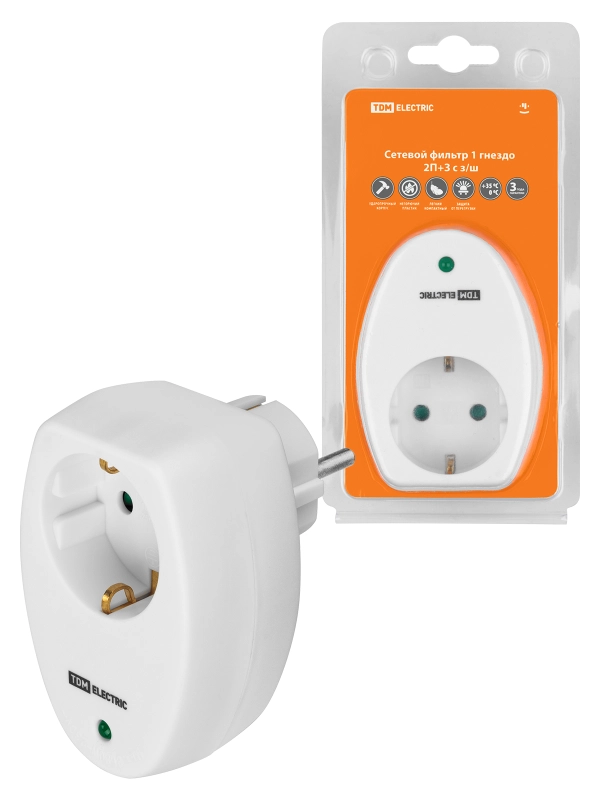 Сетевой фильтр 1 гнездо 2П+З с з/ш 16А 250В белый TDM
