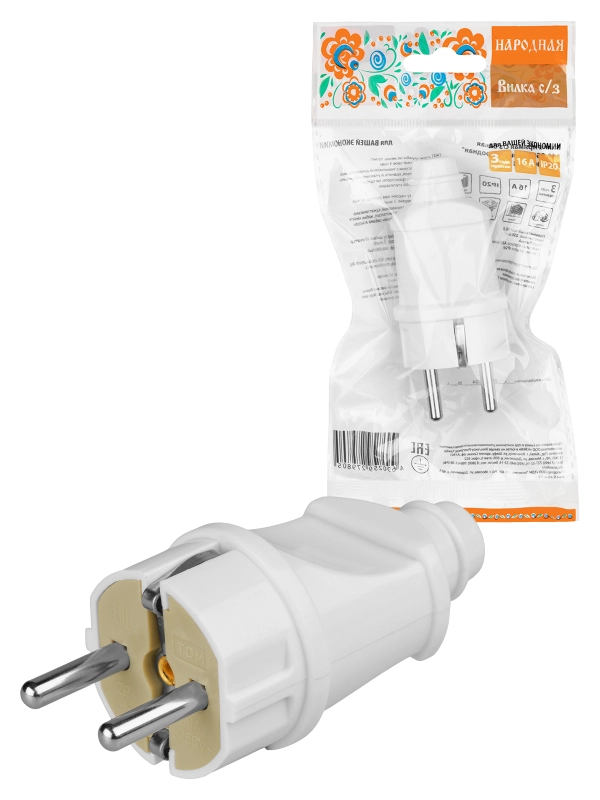 Вилка прямая с/з белая 16А 250В серии "Народная"