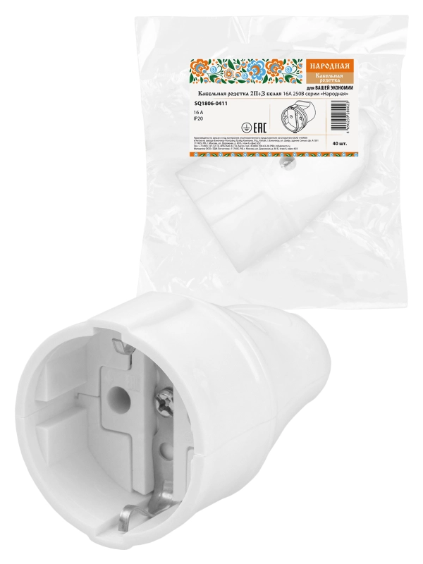 Кабельная розетка 2П+З белая 16А 250B серии "Народная"