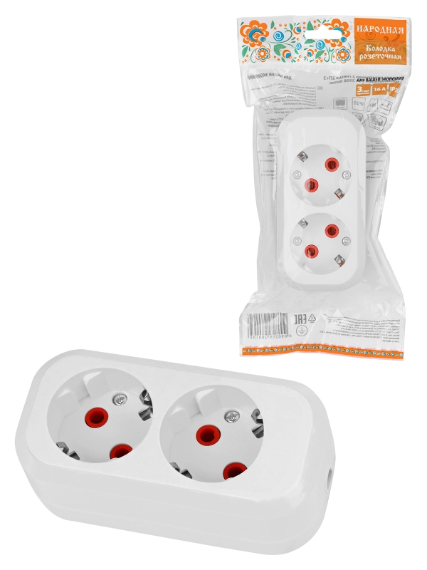 Колодка розеточная 2 гнезда 2П+З 16А 250В белая серии "Народная"