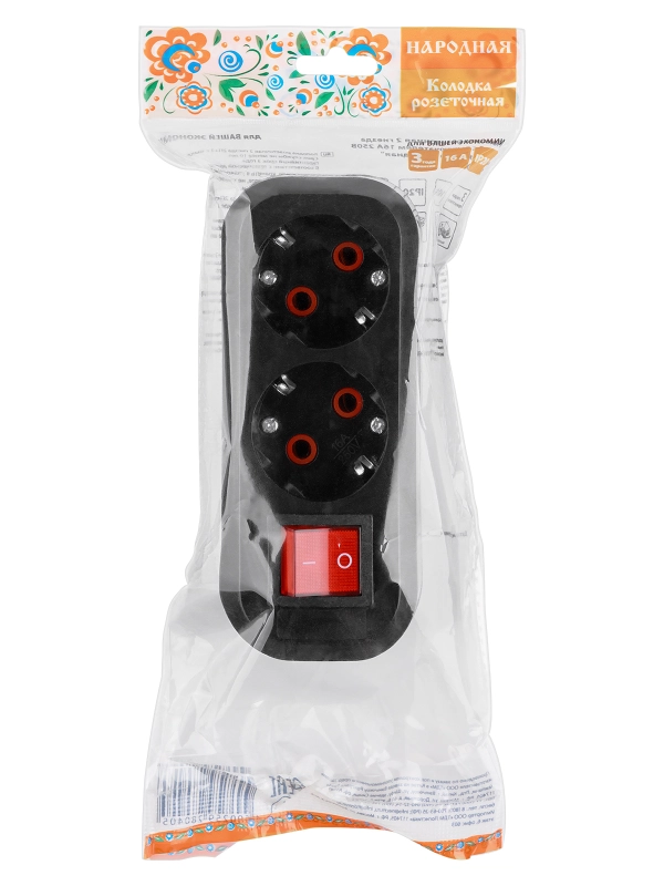 Колодка розеточная 2 гнезда 2П+3 c выключателем 16А 250В черная серии "Народная"