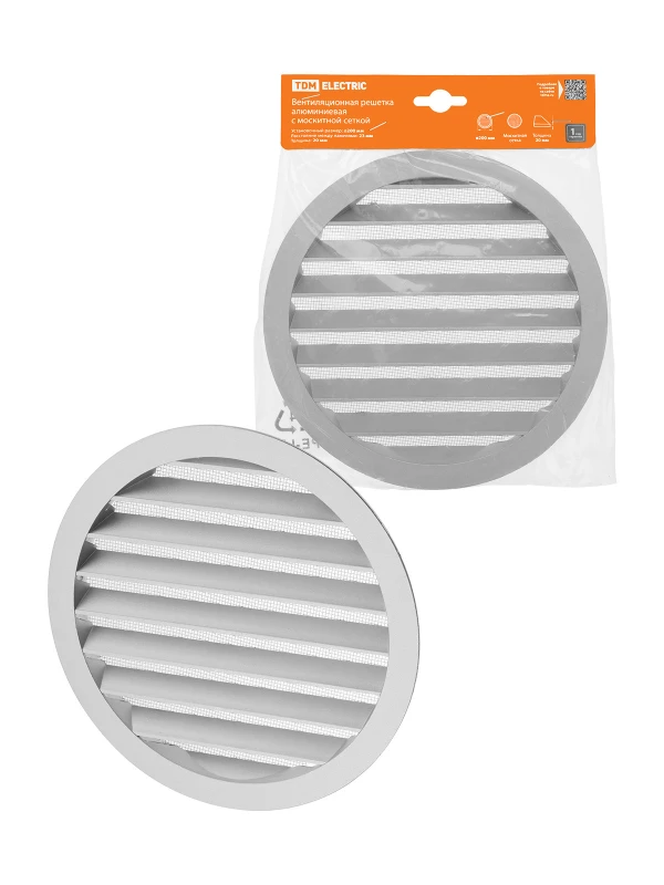 Решетка вентиляционная круглая алюминиевая с москитной сеткой, с фланцем d200, внеш. D225, TDM