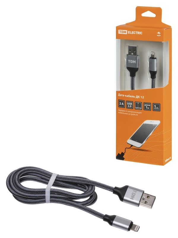 Дата-кабель, ДК 12, USB - Lightning, 1 м, тканевая оплетка, серый, TDM