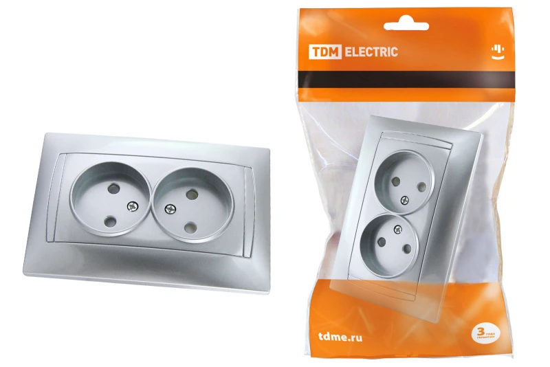 Розетка электрическая TDM со шторками без заземления двойная (Серебристый металлик)