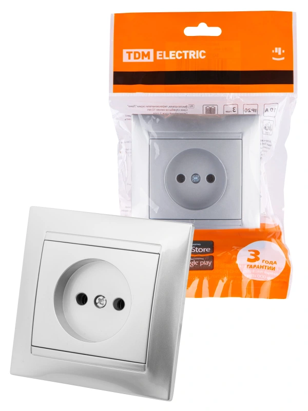 Розетка электрическая TDM без заземления с рамкой (Серебристый металлик)