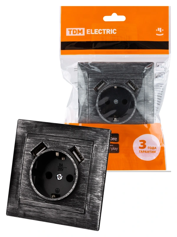 Розетка 2П+З 16А 250В + 2 USB порта 2,1А 5В старинное серебро "Лама" TDM